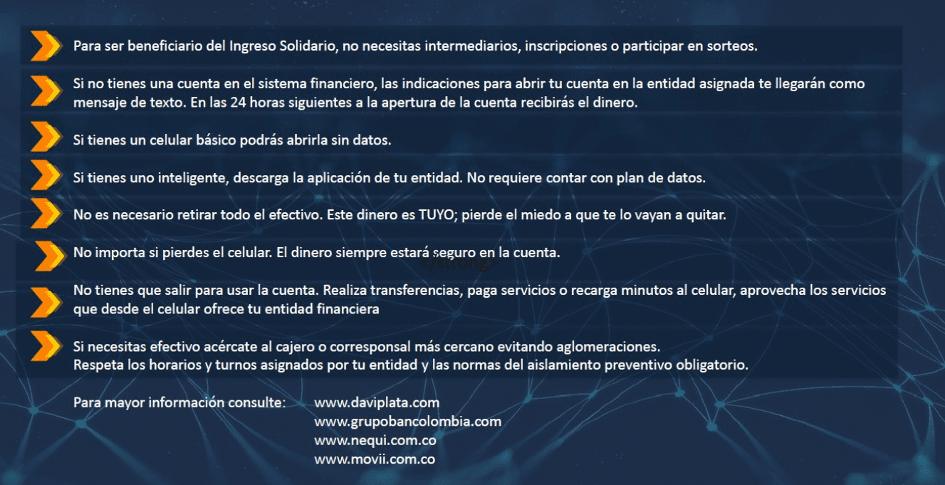 Estos serán los procesos para que los beneficiarios reciban el giro solidario en esta segunda etapa: 1. Los beneficiarios sin entidad financiera serán contactados para la apertura de cuentas digitales, bancarizados. 2. Después de haber realizado el proceso de apertura de la cuenta, por parte de la entidad financiera, el abono será realizado en las siguientes 24 horas.